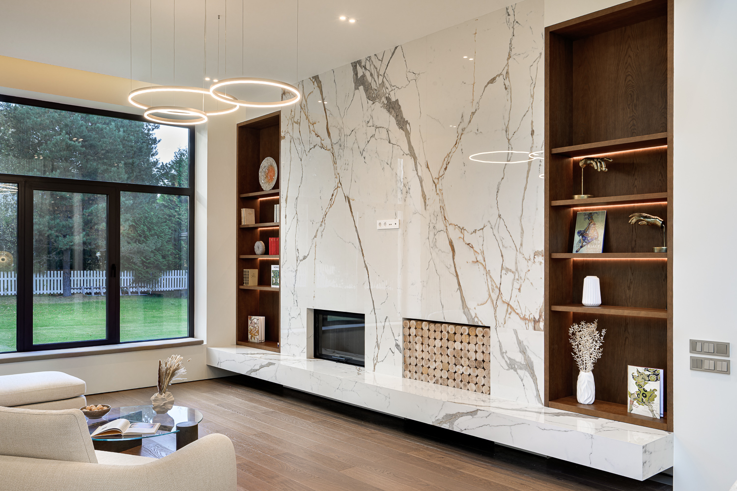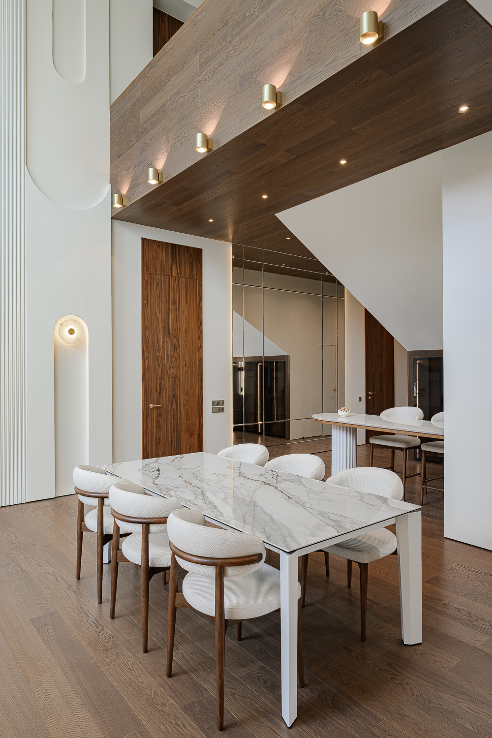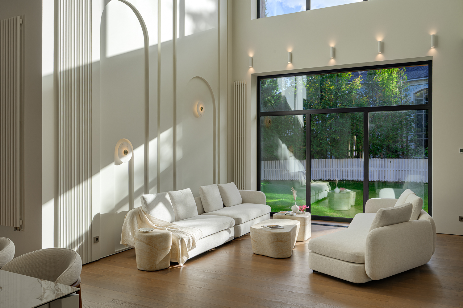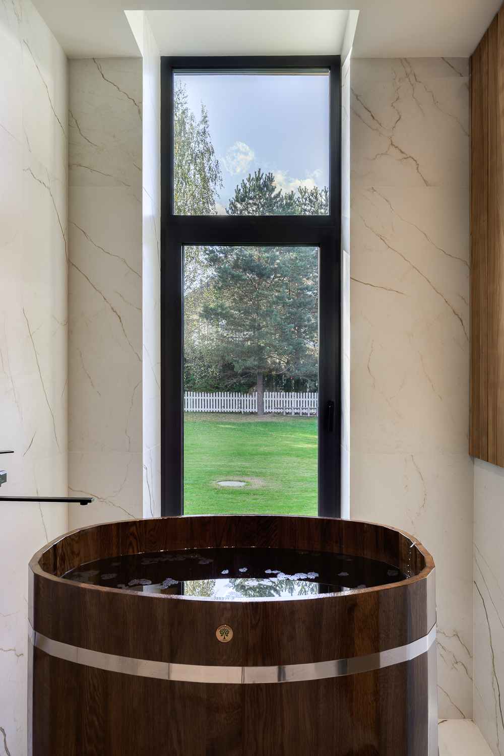 Ощущение пространства в доме обеспечивает большая площадь остекления и высота потолков в комнатах от 3,5 до 7,2 м, а также великолепные виды из окон на все 4 стороны.